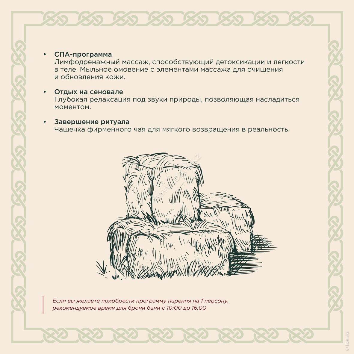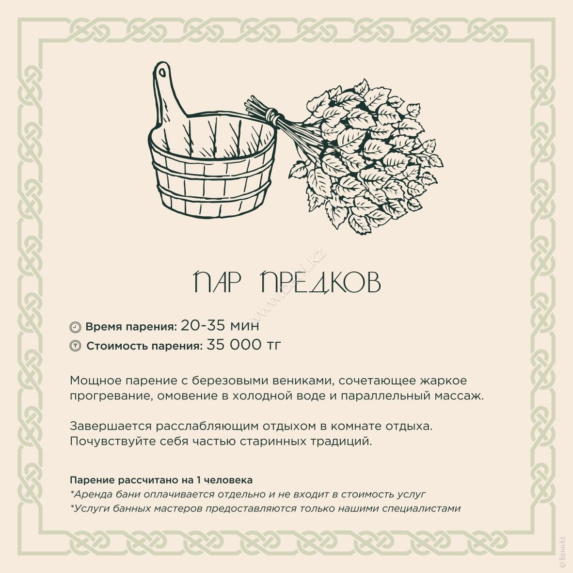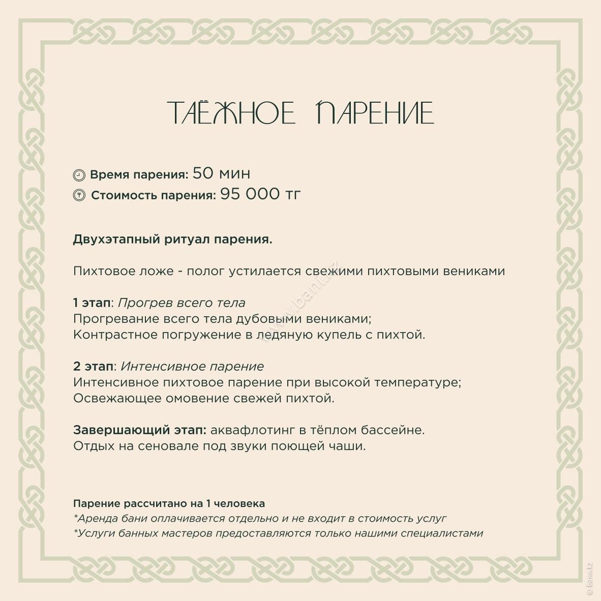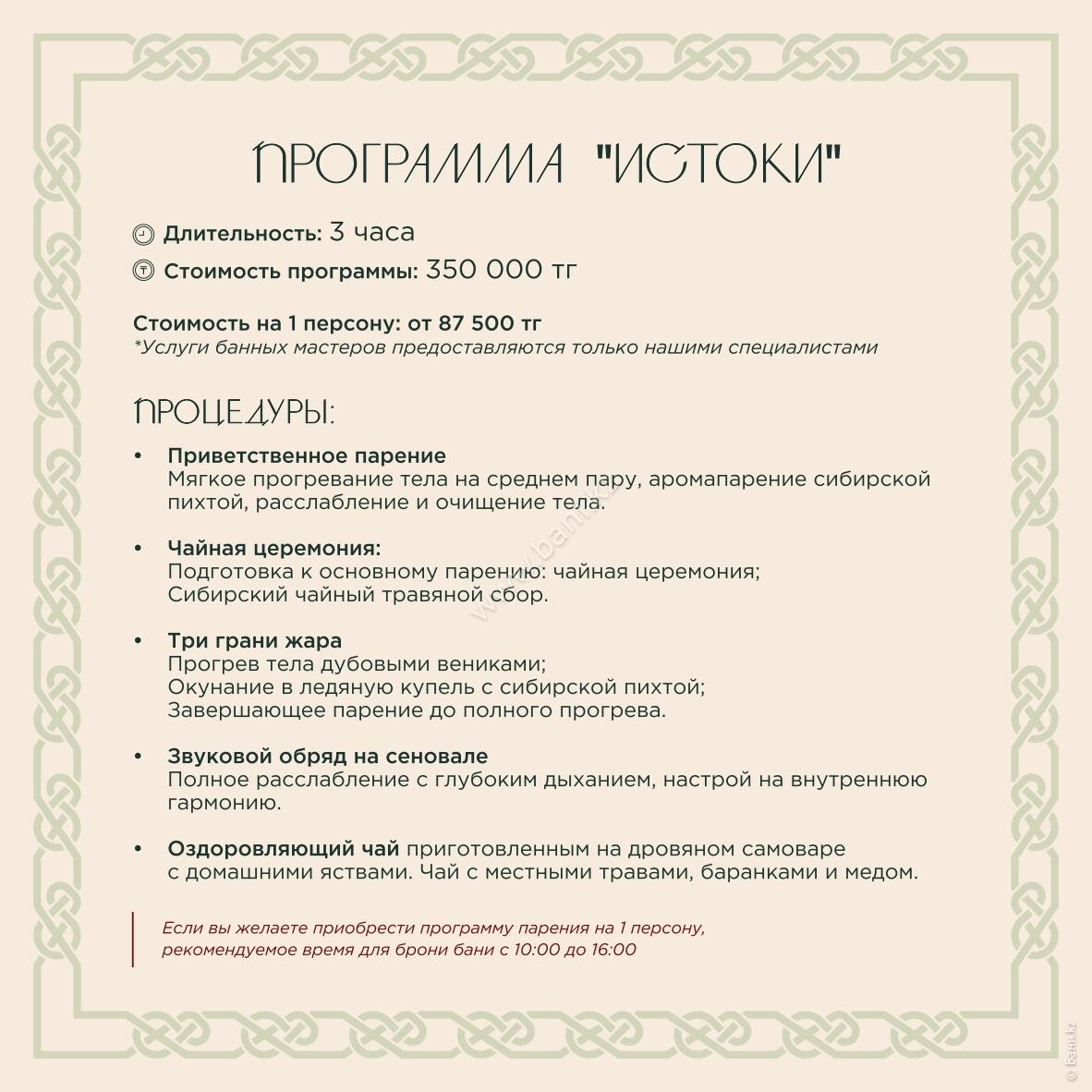 - Истопка: вместимость 4–6 персон, площадь 105 кв.м., стоимость 25000тг/час, минимальное время 3 часа.