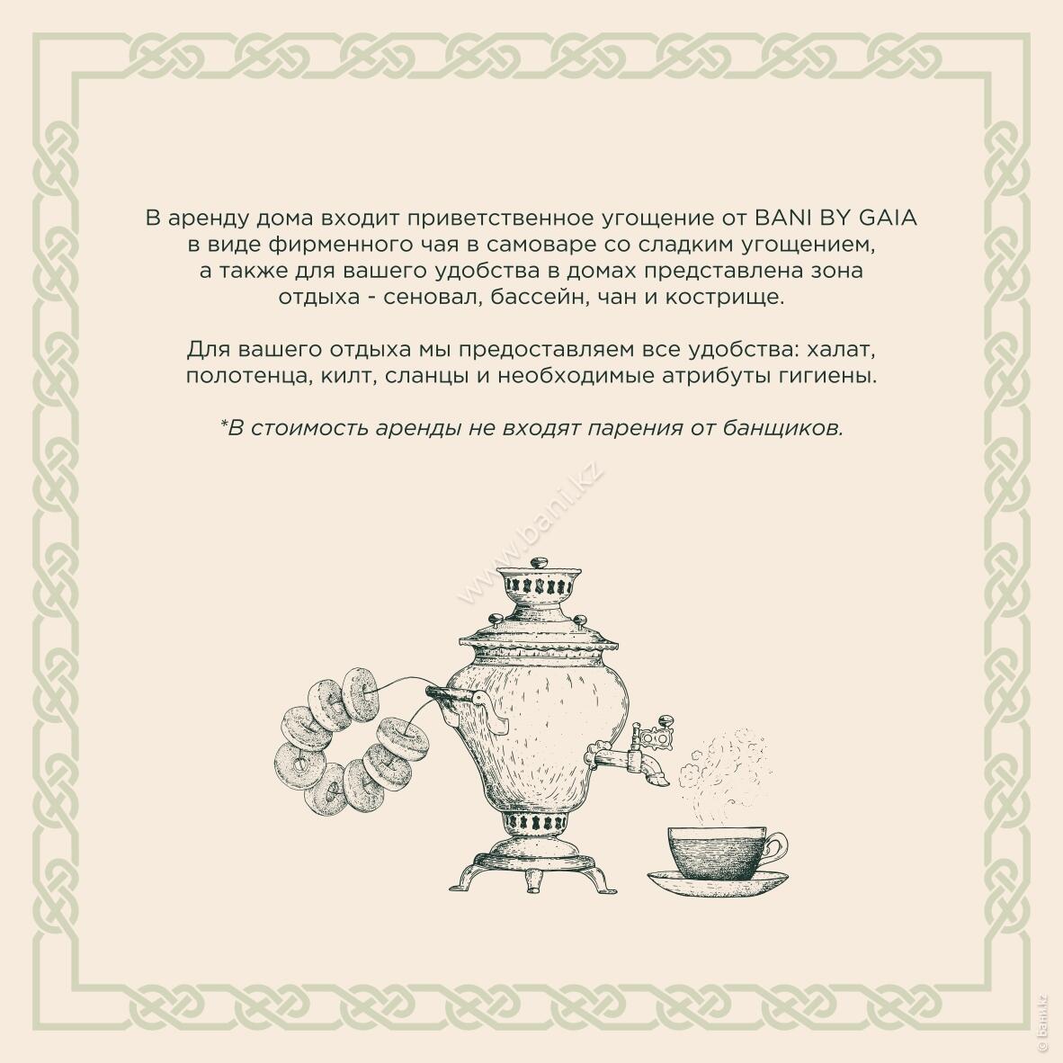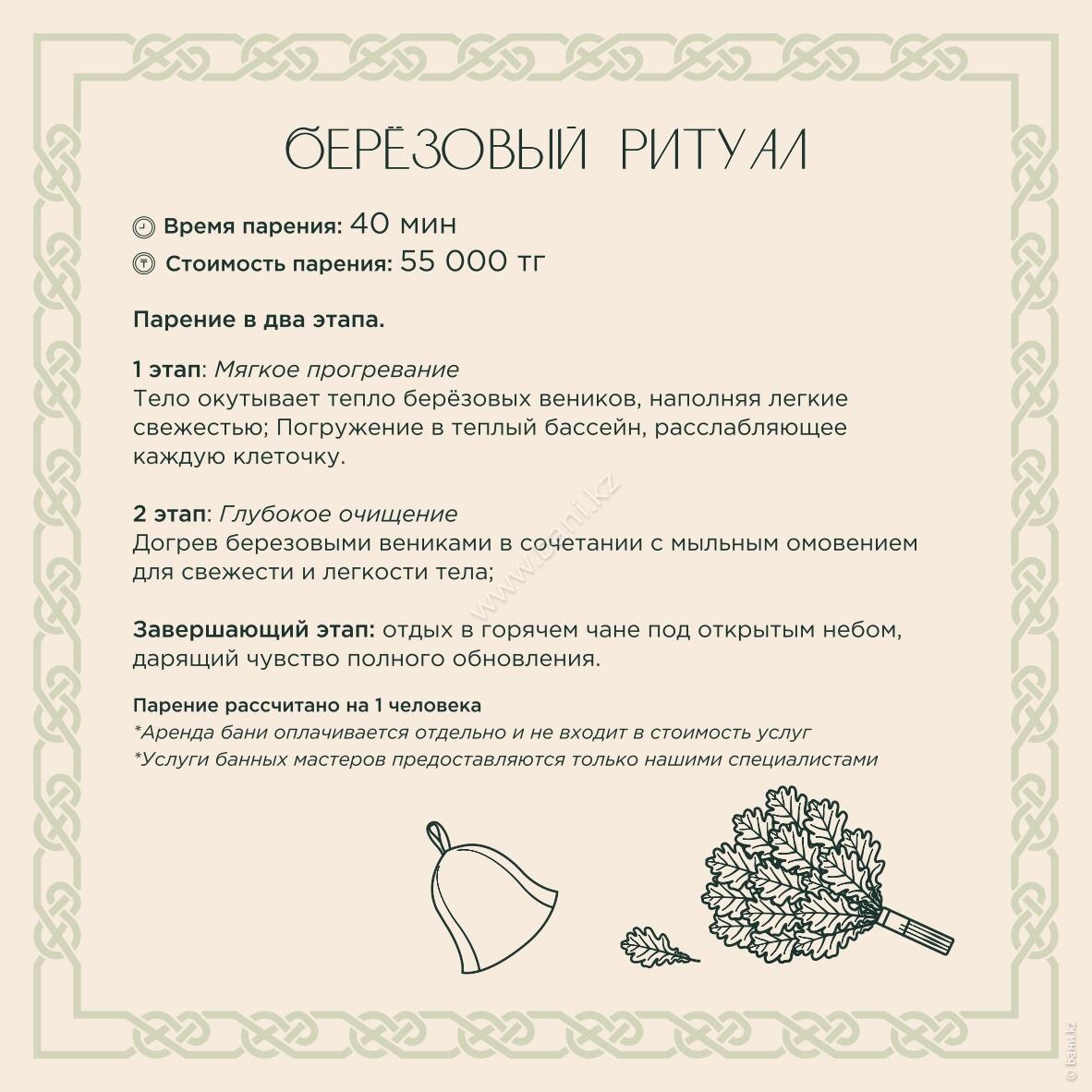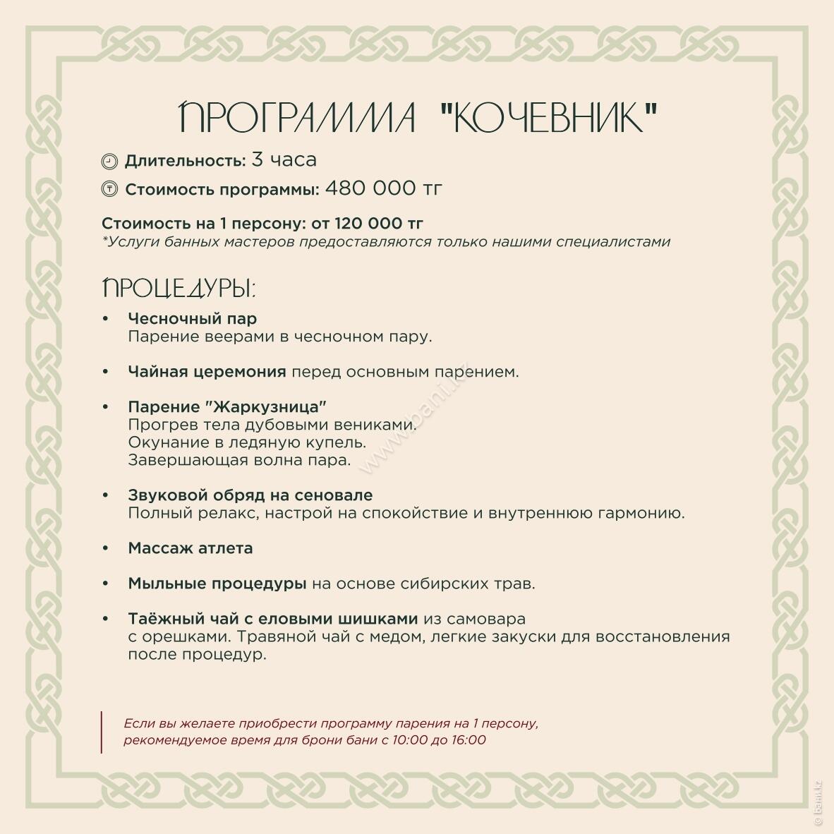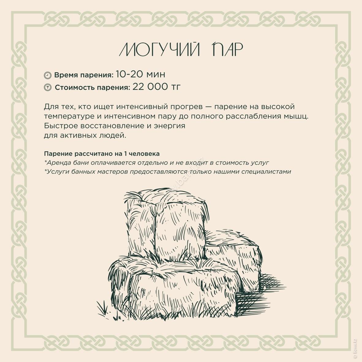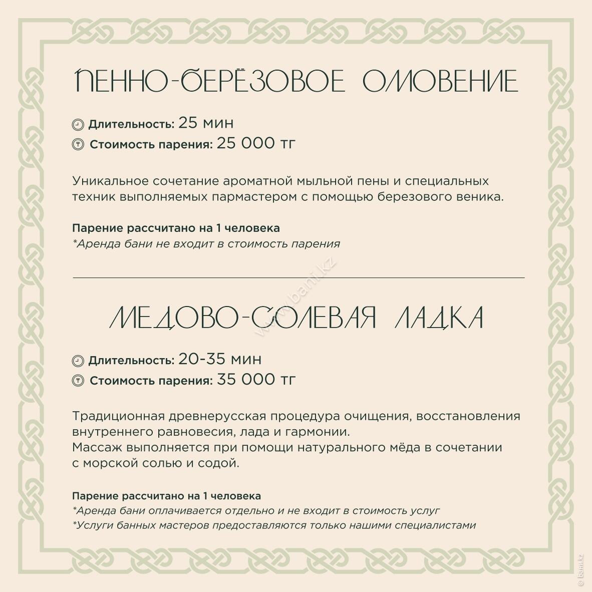 - Истопка: вместимость 4–6 персон, площадь 105 кв.м., стоимость 25000тг/час, минимальное время 3 часа.