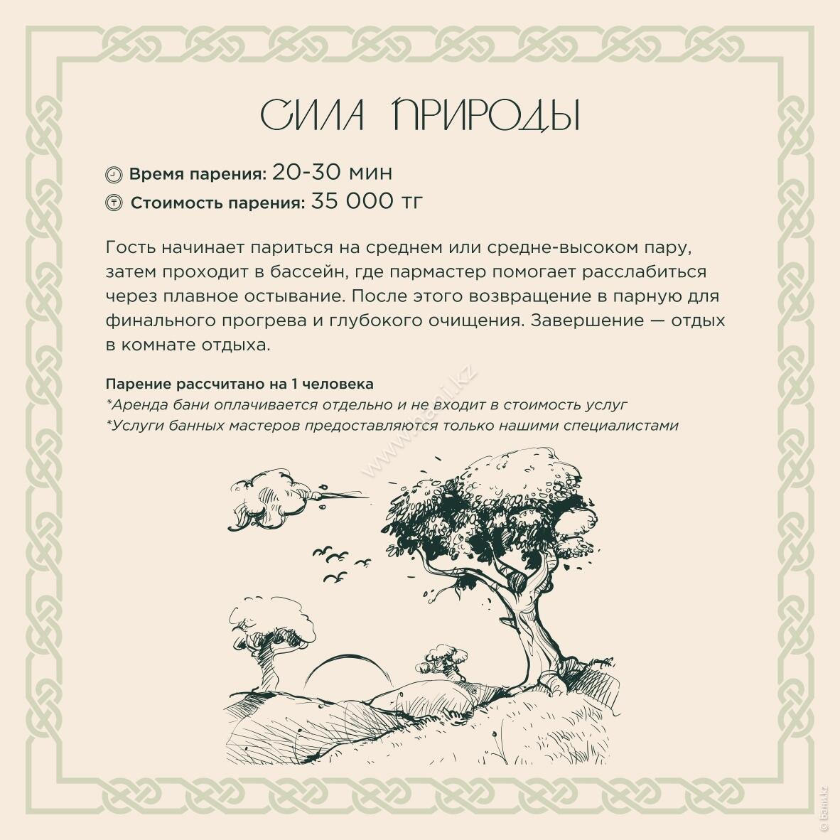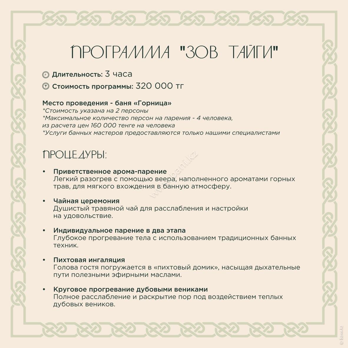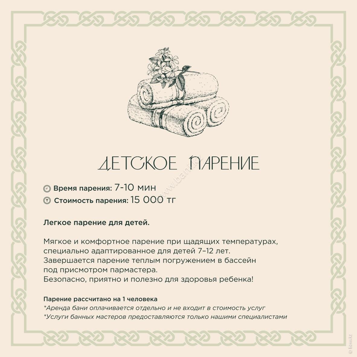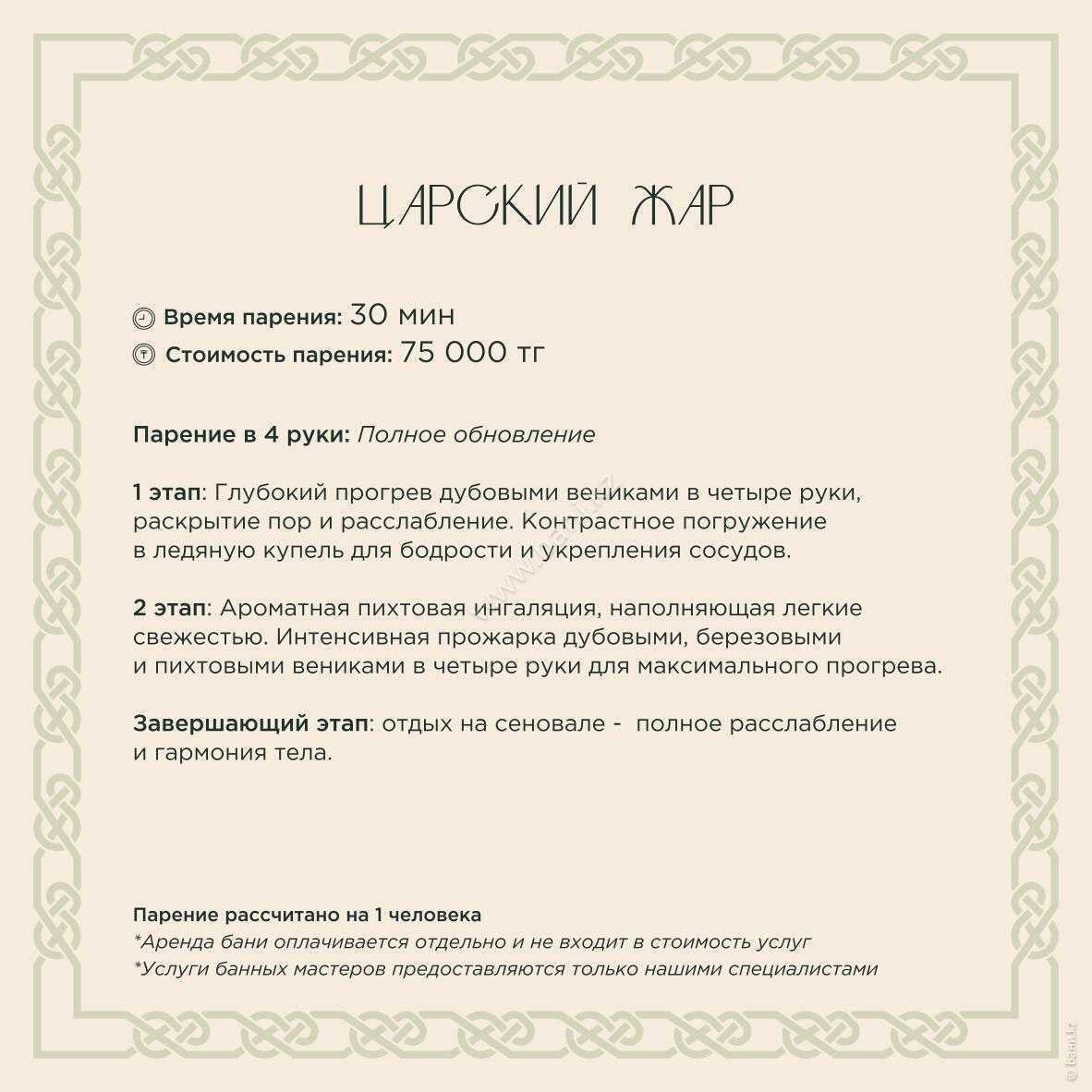 - Истопка: вместимость 4–6 персон, площадь 105 кв.м., стоимость 25000тг/час, минимальное время 3 часа.