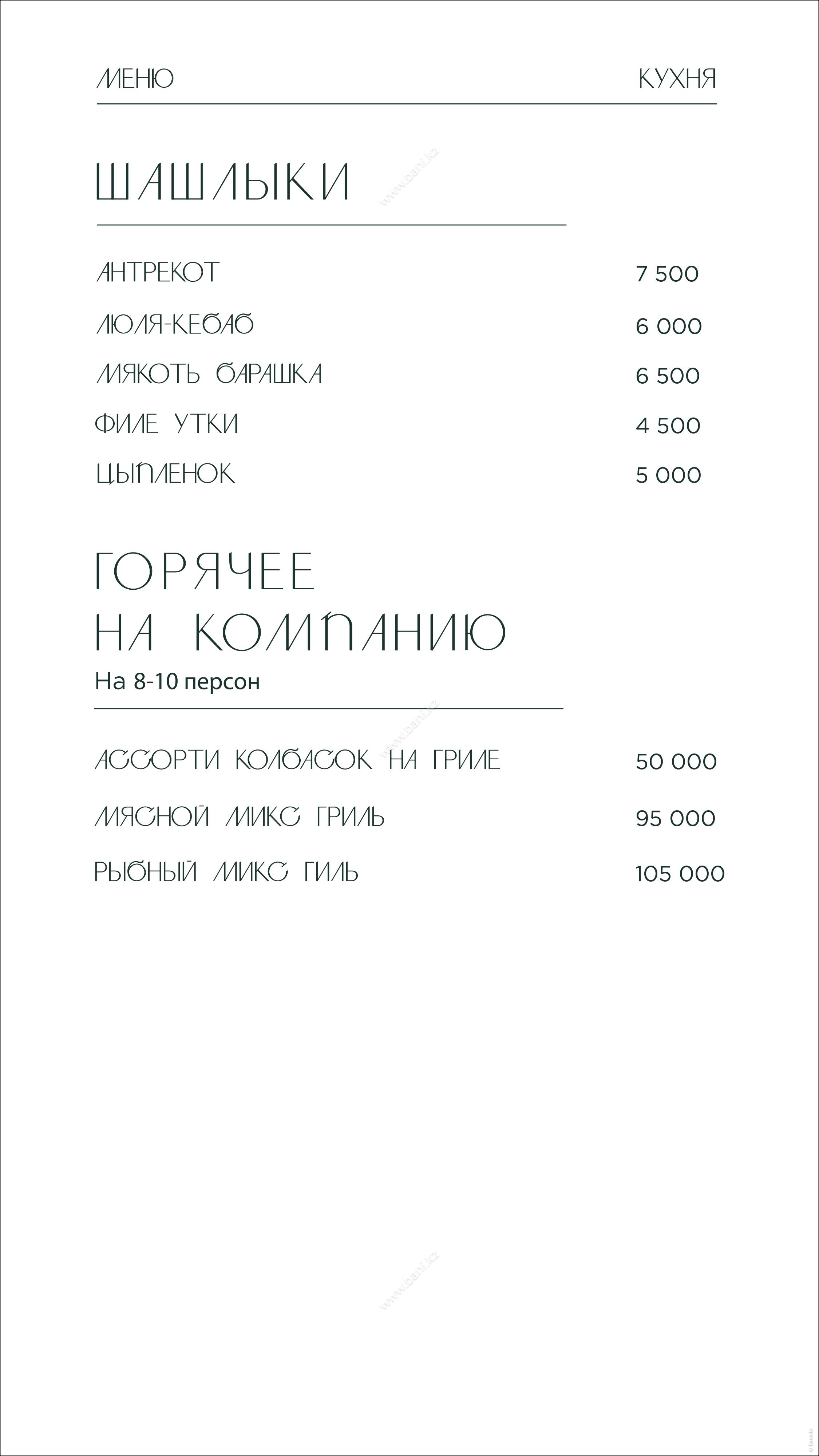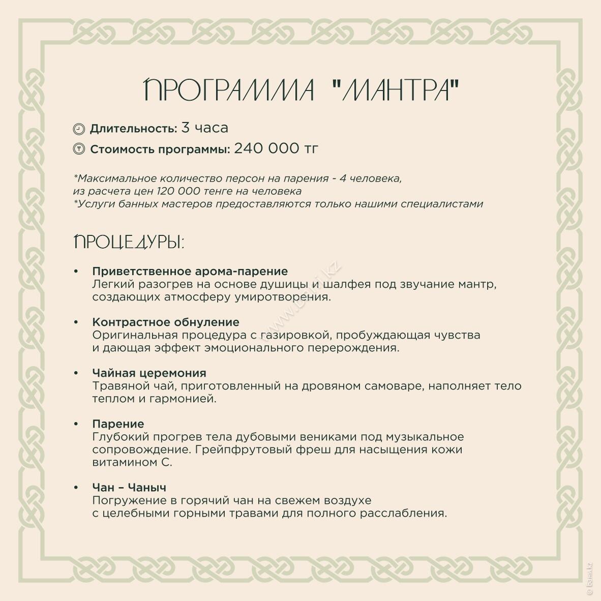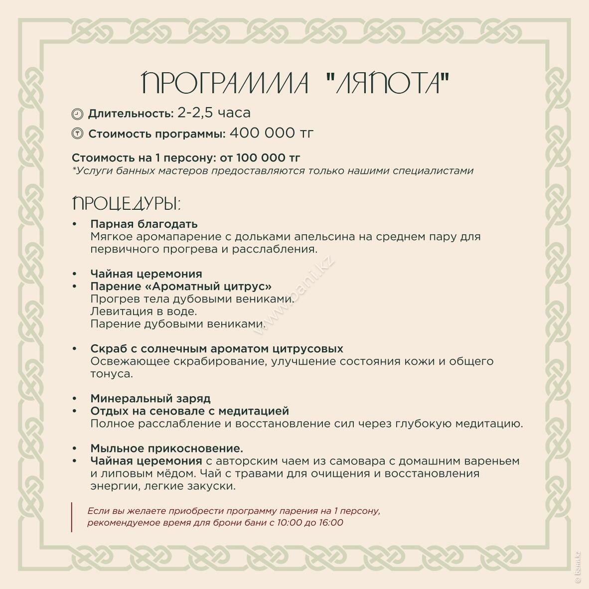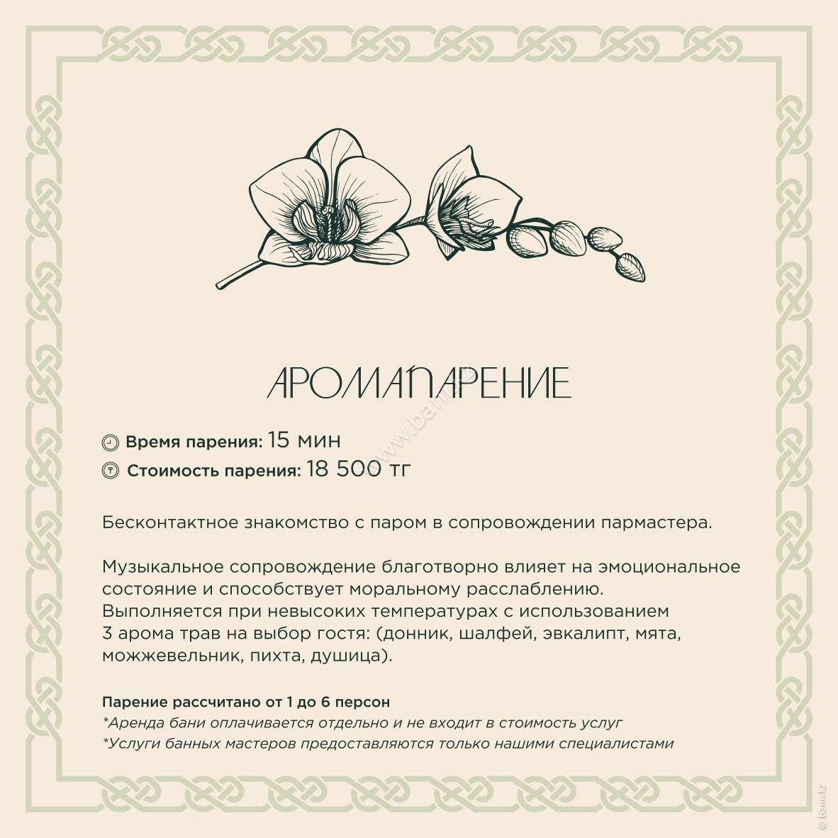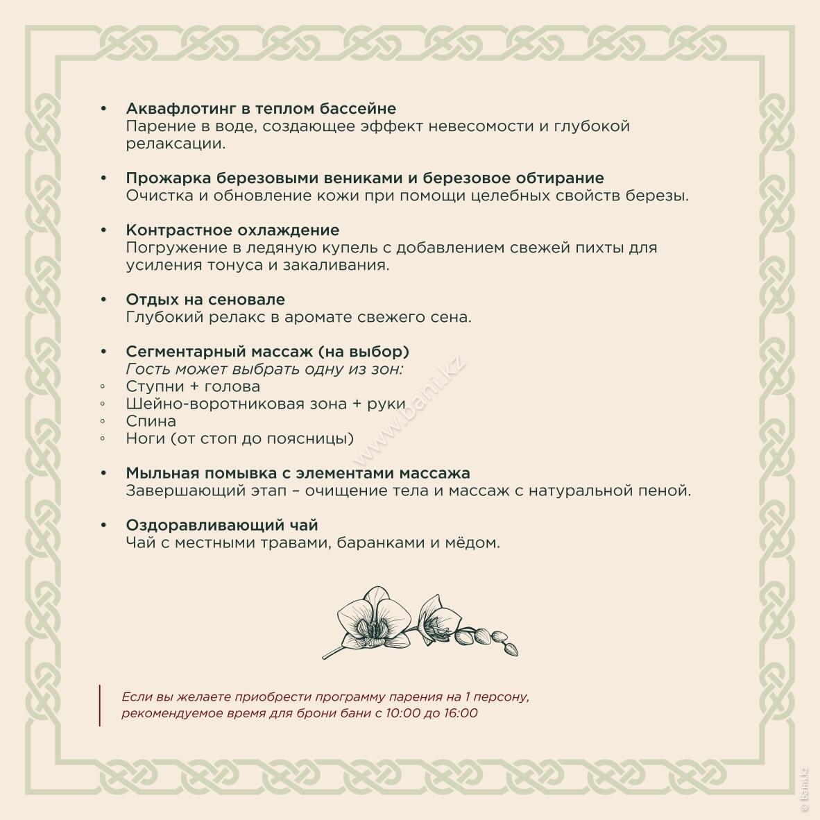 - Истопка: вместимость 4–6 персон, площадь 105 кв.м., стоимость 25000тг/час, минимальное время 3 часа.